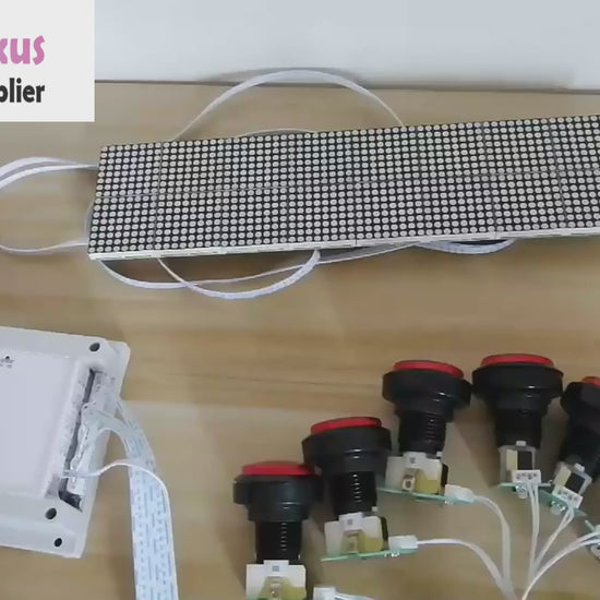 How to Play: The dot matrix screen displays N letters simultaneously, and N buttons control each letter of the English alphabet, starting from A to Z. Each time a button is pressed, the corresponding letter changes one digit. When all letters match the set letter, two relays are triggered to clear the level. Restart the power supply to reset.