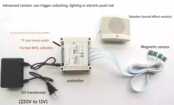 Simultaneous Advanced: N magnetic sensors approaching each other simultaneously trigger unlocking, lighting a light, or triggering a lever. You can set a specific number of magnetic sensors to trigger a magnetic force simultaneously. Too many or too few sensors will trigger no trigger. Sequential Advanced: Place magnetic material on N sensors in the order you specify to trigger unlocking, lighting a light, or triggering a lever. You can set the sensing order, allowing the same sensor to sense multiple times, and support setting passwords from 1 to 100 characters.