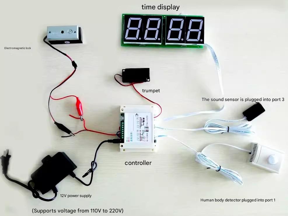 Instructions: After powering on, the controller enters standby mode and plays the first audio clip. After 60 seconds, the mechanism begins. Once a person is detected, the game begins (a countdown begins on the time display). Continuous silence for a set time (20 seconds, 40 seconds, 60 seconds, 90 seconds, 2 minutes, 2 minutes and 30 seconds, or 3 minutes) triggers the mechanism and plays the second audio clip. If a sound is heard during the detection process, the timer resets. Each time a sound is detected, the controller beeps. After successfully triggering the mechanism, the controller resets.